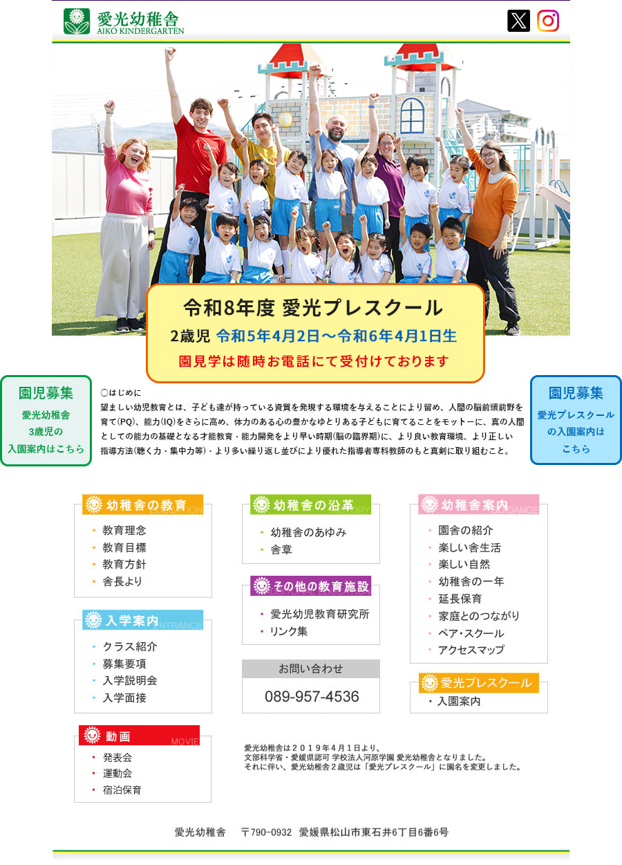 愛光幼稚舎 愛光幼稚舎入園案内 愛光プレスクール入園案内 教育理念 教育目標 教育方針 舎長より クラス紹介 募集要項 入学説明会 入学面接 発表会 運動会 宿泊保育 幼稚舎のあゆみ 舎章 愛光幼児教育研究所 リンク集 電話番号 0899574536 園舎の紹介 楽しい舎生活 楽しい自然 幼稚舎の一年 延長保育 家庭とのつながり ペア・スクール アクセスマップ 愛光プレスクール入園案内 X(Twitter) Instagram